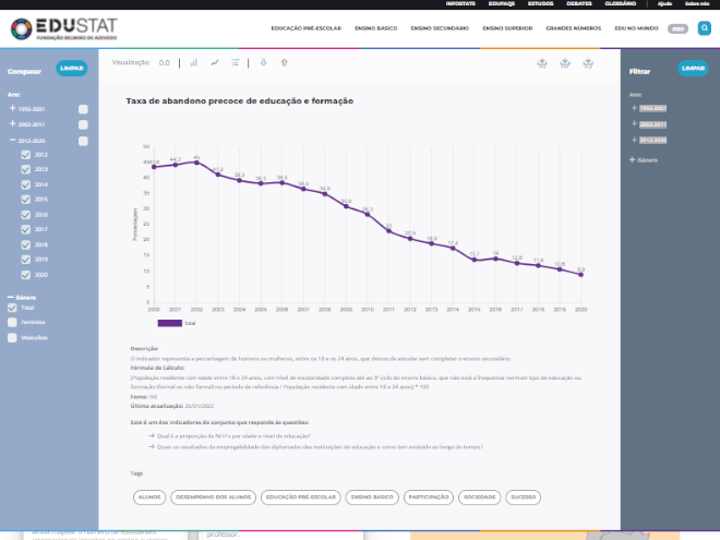 O seu projeto de conceção teve, assim, como objetivo a definição e a sistematização de um conjunto de indicadores/métricas explanatórias que permitisse o conhecimento da situação atual, tendências de evolução e principais dinâmicas estruturais do sistema de ensino português, proporcionando uma leitura crítica do sistema de educação para diferentes públicos: público em geral, responsáveis por políticas públicas, investigadores e professores / educadores / formadores.